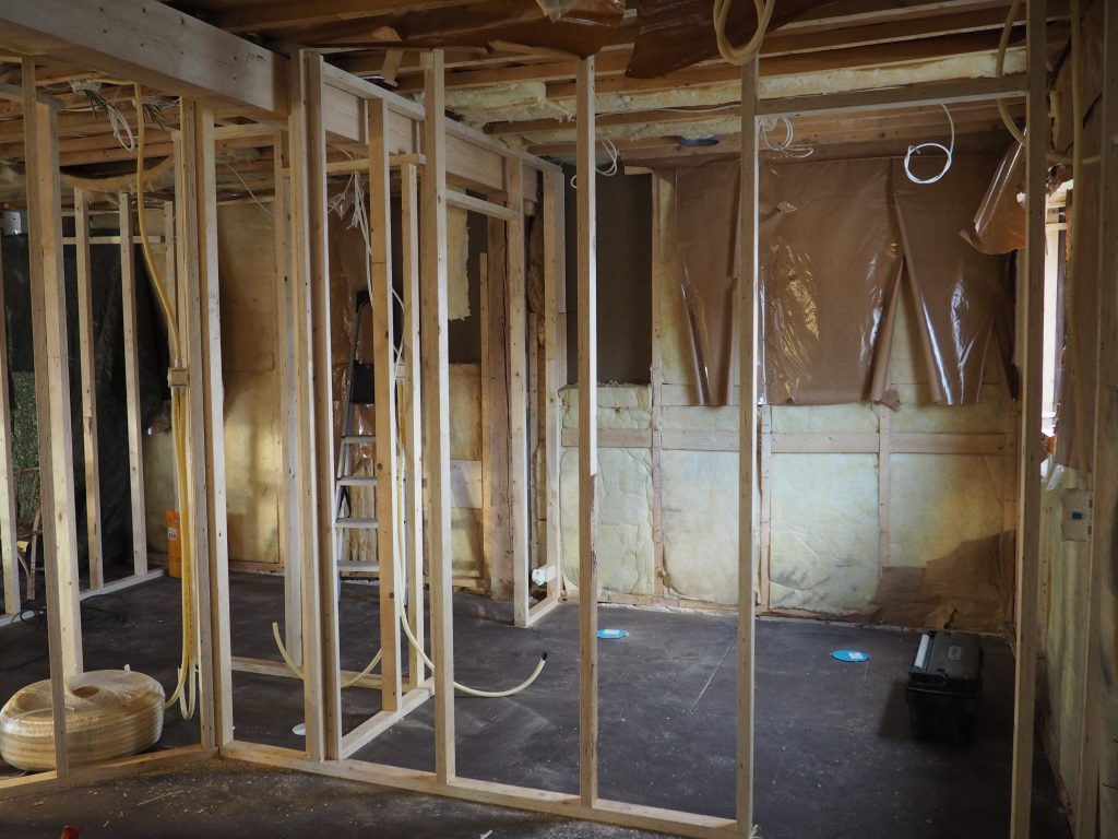 På plats är redan nya golvpelare och golvbalkar och själva golvstommen är byggd och isolerad. Nya avlopp och vattenrör är installerade, mellanväggsfackverket är byggt och även några mellanväggsskivor är redan på sin plats.