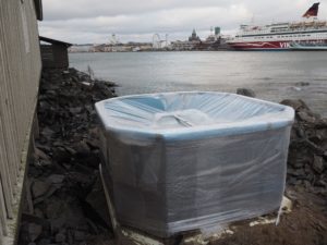 På östra sidan av byggnaden har man gjort utrymme för en badbalja som tillfälligt har flyttats på plats. Baljan flyttas senare lite längre ut från byggnaden. Den 29 november slutfördes arbetena för denna höst och fortsätter på våren så fort isarna har gått.