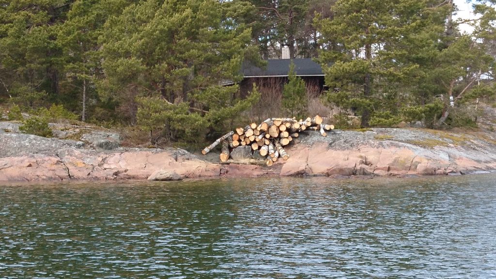 Som ni ser på bilden så har det levererats ved till holmen, äkta storstadsved från träd fällda på Blekhomen. Om det kalla vädret fortsätter och ni absolut vill få varmt så motsätter sig ingen ifall ni bär upp stammarna till vedbacken bakom bastun.