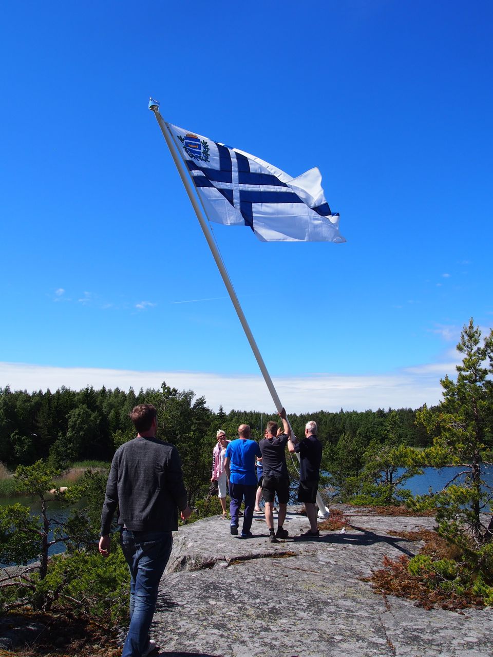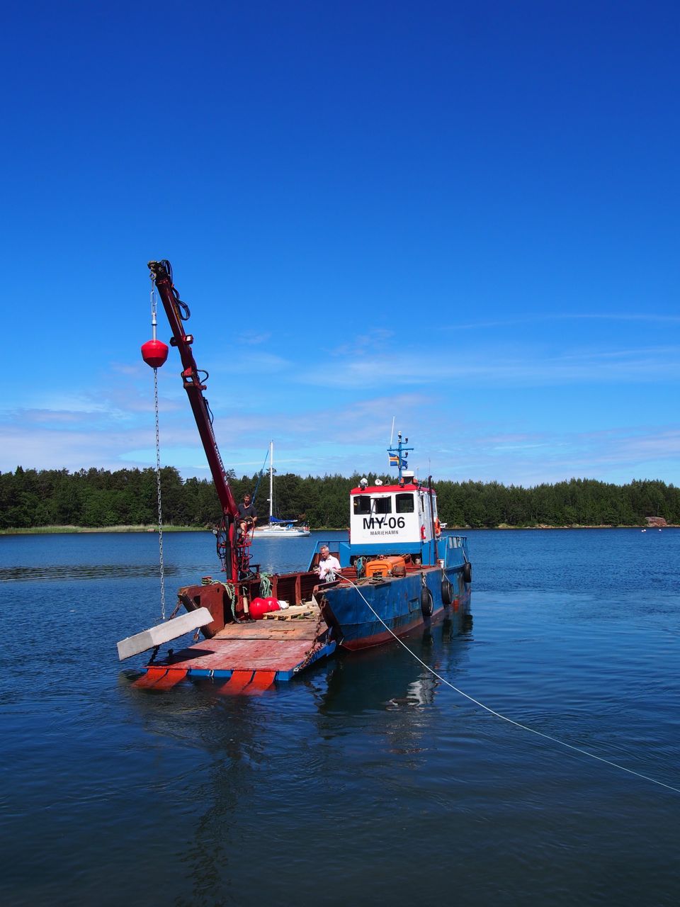 Dagen började med att Jan Lönnqvist med arbetsbåten My-06 anlände med bojar, bojtyngder, bergskilar och hamnbokslådan. Med var också den nya Abborrgrundsintendenten Niklas Ekman från Mariehamn. Angörningsöglorna och bojarna installerades och flaggstången restes. Hamnboken och livringen fick en egen stolpe.
